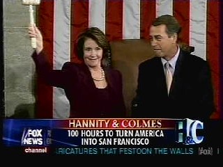 FOX News Banner On Nancy Pelosi says, “100 Hours To Turn America Into San Francisco” – Sean Hannity was full of predictably peevish partisanship last night (1/4/07) on Hannity & Colmes as he made the ludicrous claim that the Democratic agenda of raising the minimum wage and combating global warming “because they have spent way too much time watching Al Gore’s new DVD†was out of step with America. But a FOX News banner across the bottom of the screen as Pelosi took the gavel was even more biased, stating, “100 Hours To Turn America Into San Francisco”.